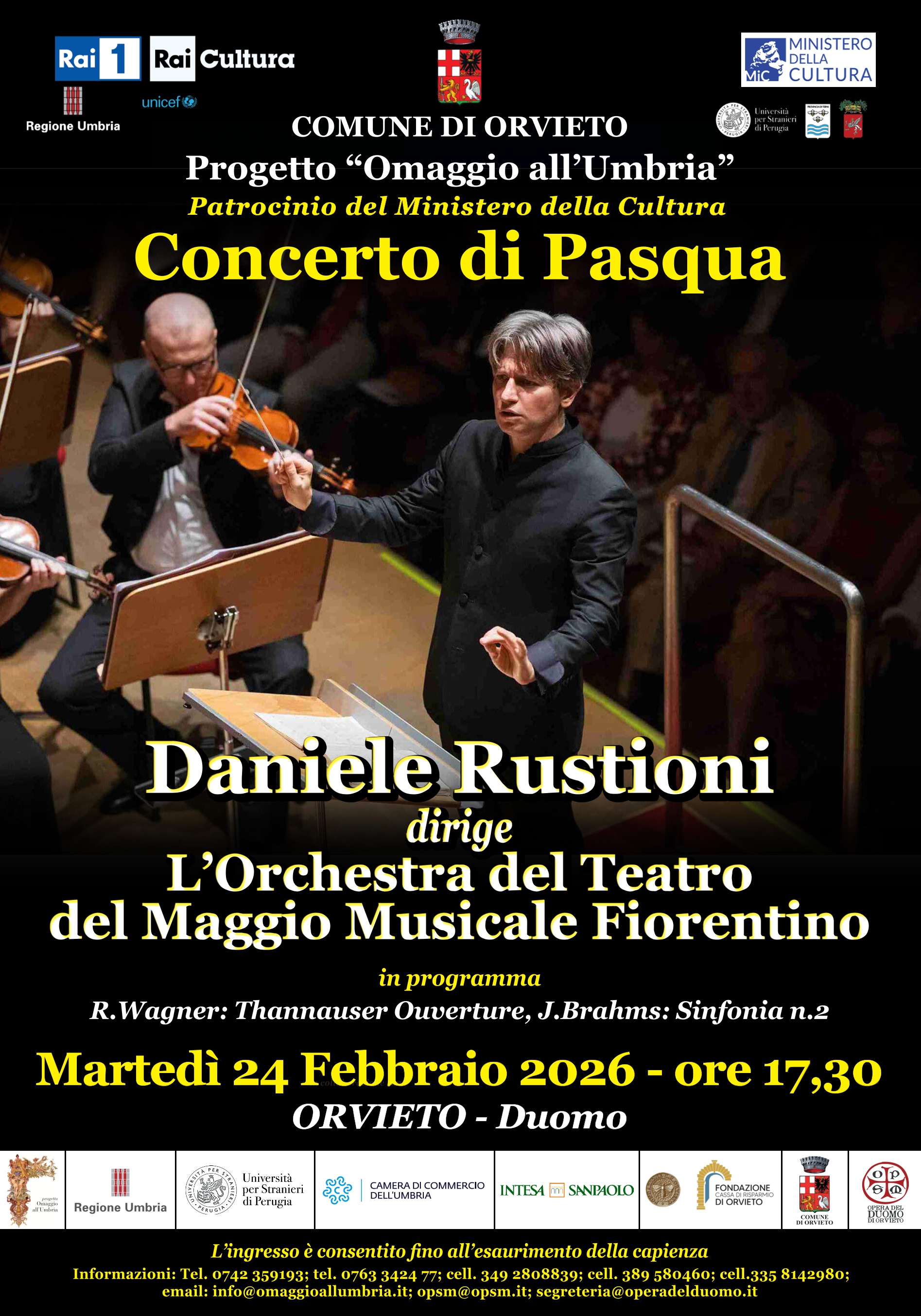 Martedì 24 febbraio 2026 alle ore 17:30, nel Duomo di Orvieto, nell’ambito del progetto "Omaggio all’Umbria”, si terrà il tradizionale Concerto di Pasqua della Rai dell’Orchestra del Teatro del Maggio Musicale Fiorentino, diretta dal Maestro Daniele Rustioni.
