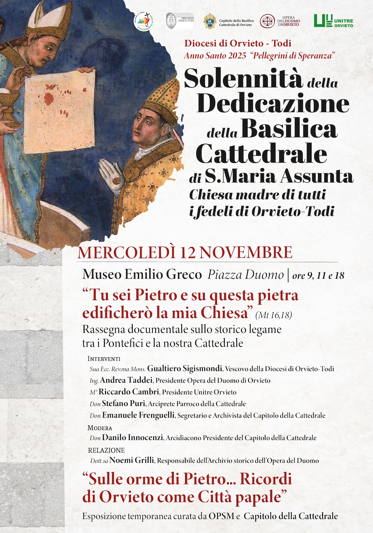 Ad aprire l’iniziativa interverranno: S.E. Mons. Gualtiero Sigismondi, Vescovo della Diocesi di Orvieto-Todi, Ing. Andrea Taddei, Presidente dell’Opera del Duomo di Orvieto, M° Riccardo Cambri, Presidente Unitre Orvieto, Don Stefano Puri, Arciprete Parroco della Cattedrale, Don Emanuele Frenguelli, Segretario e Archivista del Capitolo della Cattedrale. A moderare l’incontro sarà Don Danilo Innocenzi, Arcidiacono Presidente del Capitolo della Cattedrale